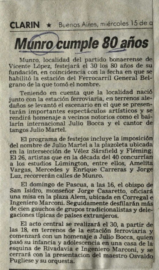 La nota publicada en el diario Clarín el 15 de abril de 1992 anuncia los festejos por los 80 años de la localidad de Munro, en Vicente López, cuya fundación se vincula con la habilitación de la estación del Ferrocarril General Belgrano. Las celebraciones incluirán homenajes a figuras destacadas como el bailarín Julio Bocca y el cantante de tango Julio Martel, cuyo nombre será otorgado a una plazoleta en Vélez Sarsfield y Fléming. Además, se realizarán diversas actividades, entre ellas un recorrido de artistas de los años 40 vinculados a los estudios Lumiton, una misa de Pascua oficiada por monseñor Jorge Casaretto en la plaza Alem, y un desfile de gauchos y delegaciones extranjeras. El acto central, programado para el 30 de abril en la estación ferroviaria, contará con un homenaje a Julio Bocca y un cierre a cargo de Osvaldo Pugliese y su orquesta.