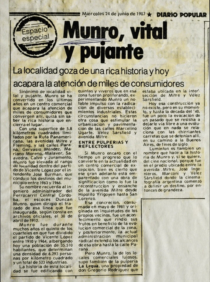 Nota del Diario Popular sobre la historia de la localidad de Munro.