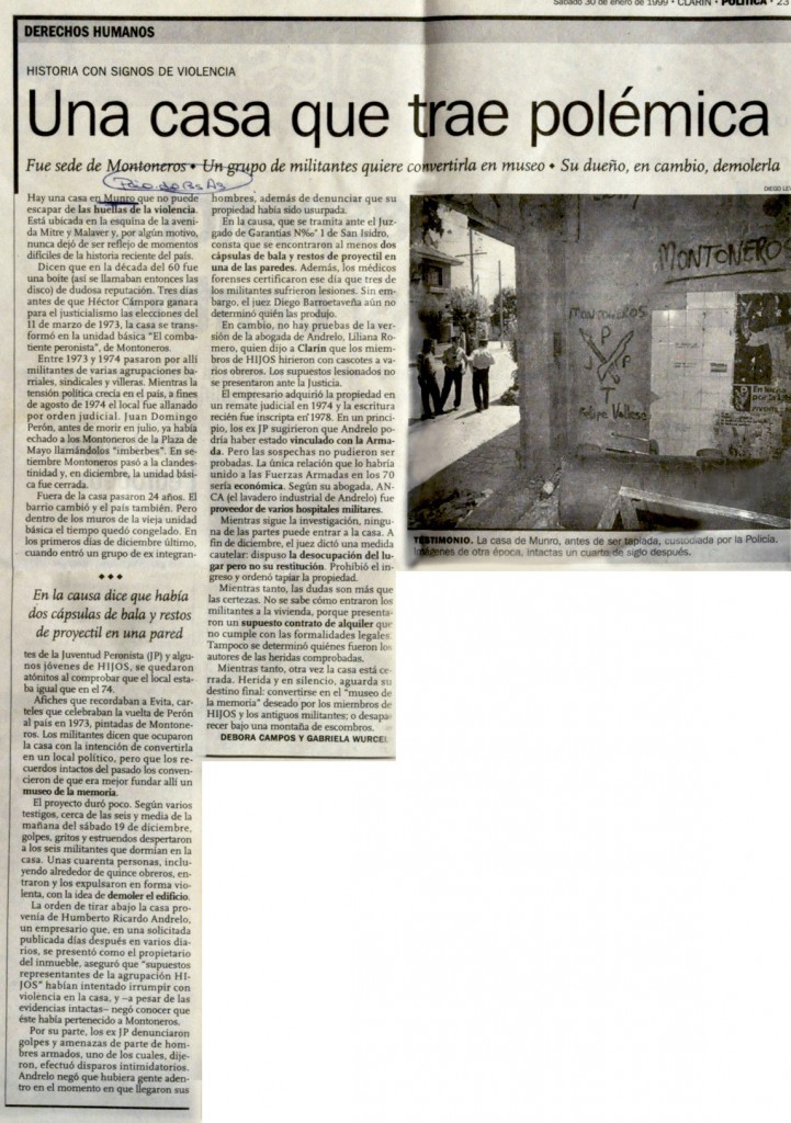 En enero de 1990, el diario Clarín abordó la disputa en torno a una antigua casa en Munro que, en los años setenta, fue sede de Montoneros. Ex militantes y miembros de la agrupación HIJOS buscaban convertirla en un museo de la memoria debido a su valor histórico, pero el propietario, Humberto Andrelo, pretendía demolerla. En diciembre de 1989, tras el ingreso de algunos militantes al inmueble, Andrelo ordenó expulsarlos y tapiar el edificio. La causa judicial, abierta tras denuncias de violencia y lesiones, terminó con una medida cautelar que impidió el acceso a la propiedad.