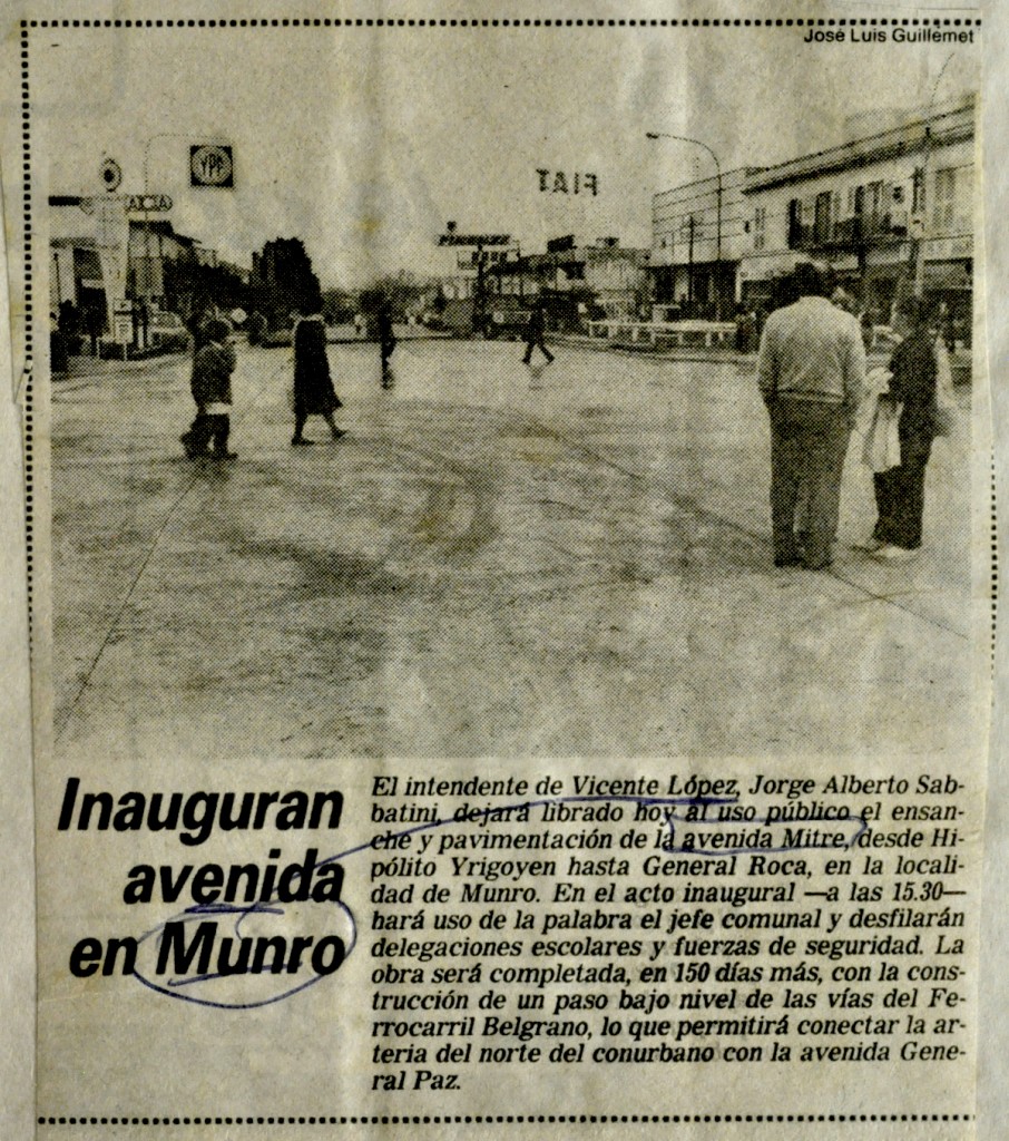 Nota periodística que anuncia de inauguración del ensanche de la venida Mitre desde Hipólito Yrigoyen hasta General Roca, en la localidad de Munro, a cargo del intendente Jorge Alberto Sabbatini.