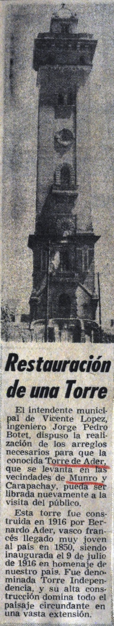 El intendente de Vicente López, ingeniero Jorge Pedro Botet, ordenó realizar las obras necesarias para restaurar la Torre Ader y reabrirla al público. Esta emblemática torre, construida en 1916 por el vasco francés Bernardo Ader, fue inaugurada el 9 de julio de ese año en homenaje a la independencia argentina.