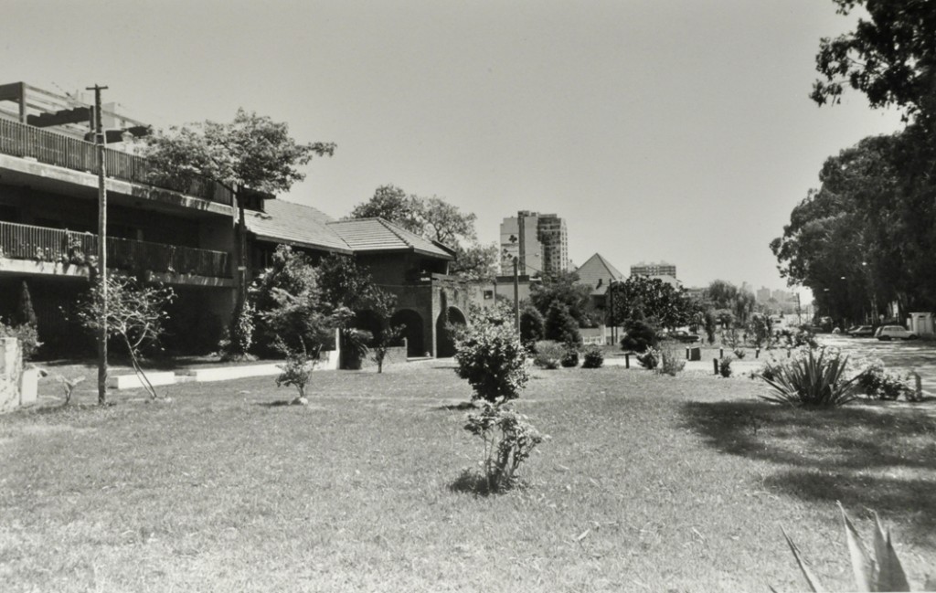 Esta imagen captura la calle Juan Díaz de Solís entre Corrientes y Carlos Villate, mostrando las casas frente a los predios del Colegio San Jorge y la Escuela Superior de la Prefectura Naval Argentina.