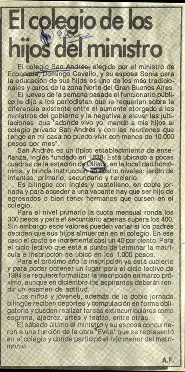 Nota periodística publicada en el diario Clarín sobre el Colegio San Andrés de Olivos, elección educativa de los hijos del ex ministro de economía Domingo Cavallo. Fundado por un grupo de inmigrantes escoceses con el propósito de educar a sus hijos en su propio idioma, cultura y fe religiosa, la primera sede del colegio abrió en Olivos en 1947, inicialmente para varones y ubicada en la calle Nogoyá 550. En 1963 se inauguró el jardín de infantes y tres años después se admitió la primera camada de mujeres. Actualmente, la escuela se encuentra en Roque Sáenz Peña 601, Olivos.