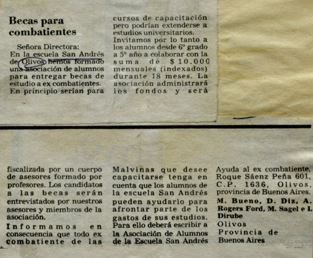 Carta de Lectores del diario Clarín de la asociación de alumnos de la Escuela San Andrés, en la que ofrecen becas para ex combatientes de Malvinas.