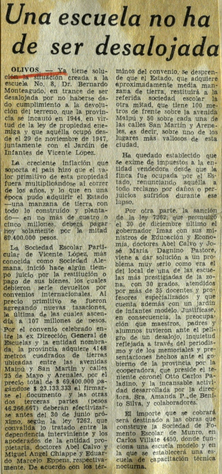 El diario Clarín informa sobre la situación de desalojo del predio donde se encuentra la Escuela Nº 8 Dr. Bernardo Monteagudo, situada en Maipú 1527, Vicente López.