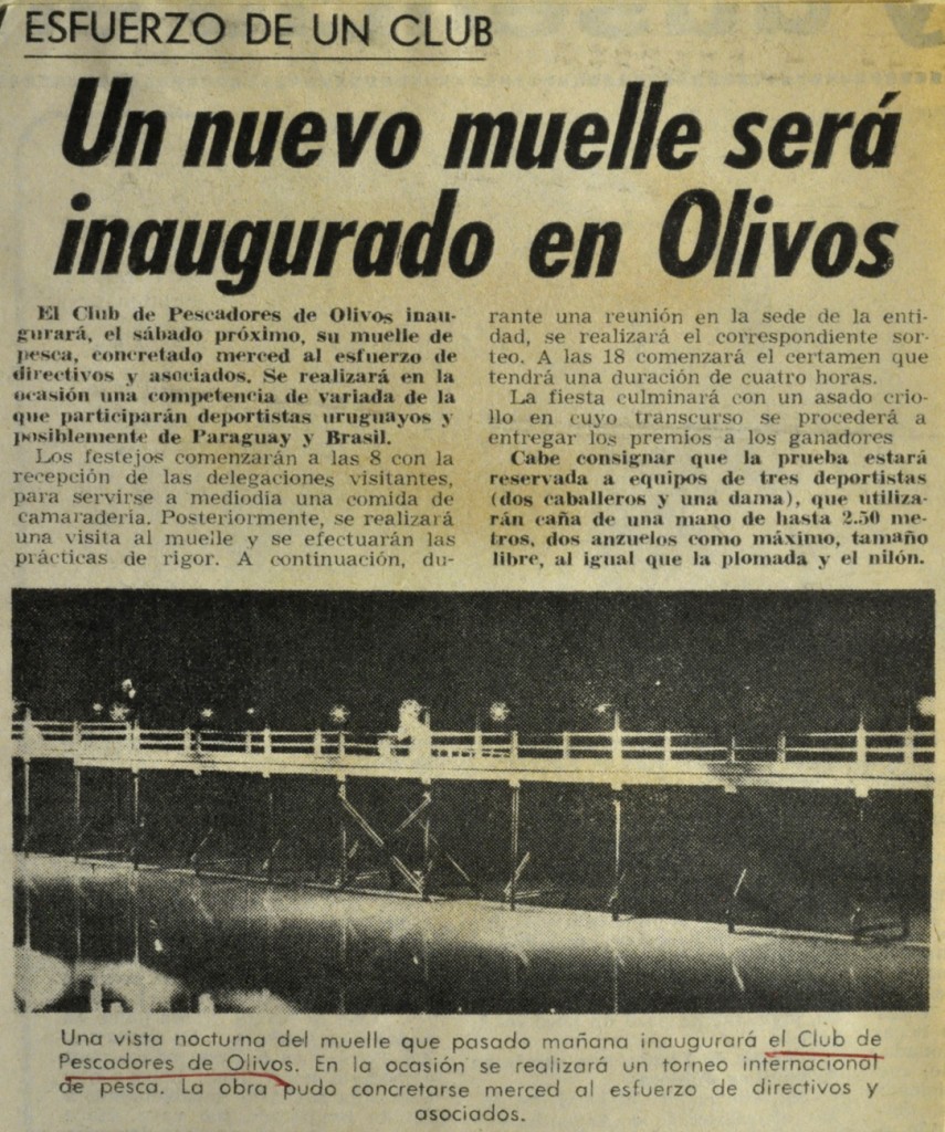 Nota del diario Clarín sobre la inauguración del nuevo muelle en el Club de Pescadores de Olivos, donde se llevó a cabo un torneo internacional de esa disciplina.