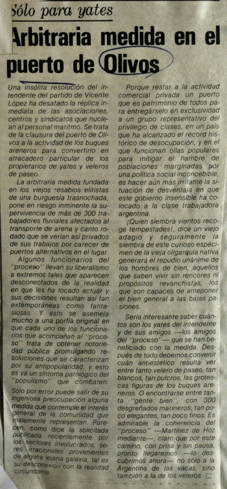 Esta transferencia generó inquietud entre los trabajadores del sector arenero, ante la posibilidad de que el puerto cerrara para convertirse en un centro deportivo náutico, ya que la zona se utilizaba para la venta de arena y canto rodado.