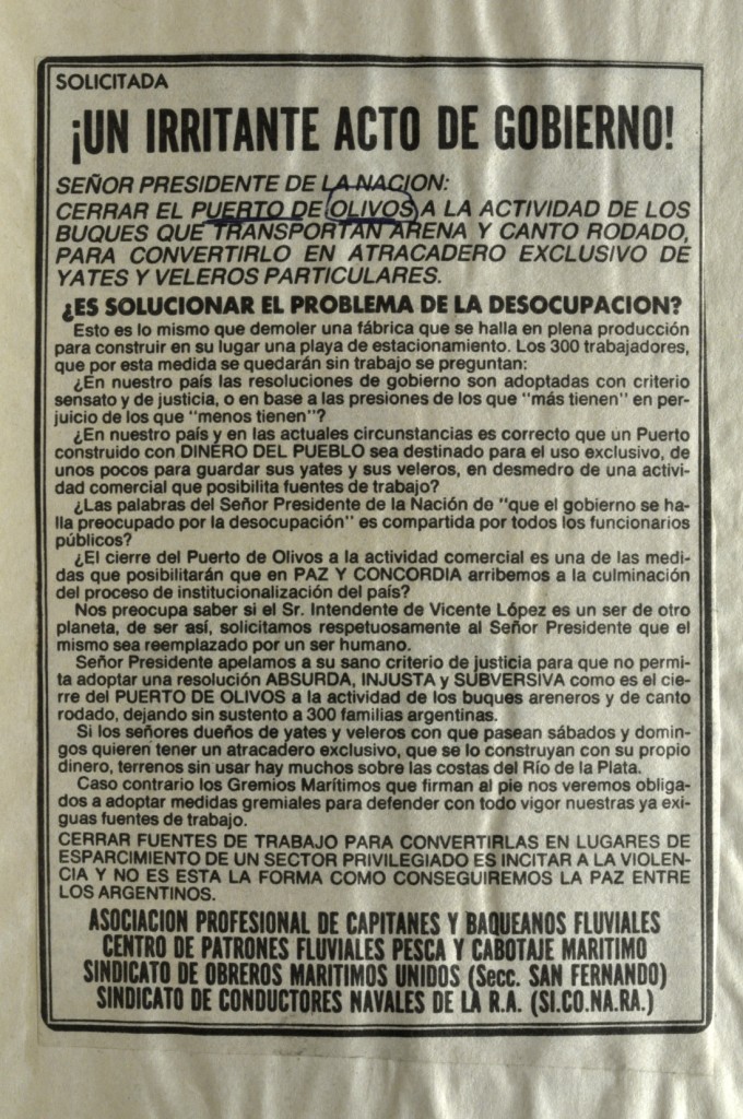 Solicitada de obreros y empresarios del sector en protesta contra la decisión gubernamental de cerrar el Puerto de Olivos a la actividad arenera, publicada en el diario Clarín.