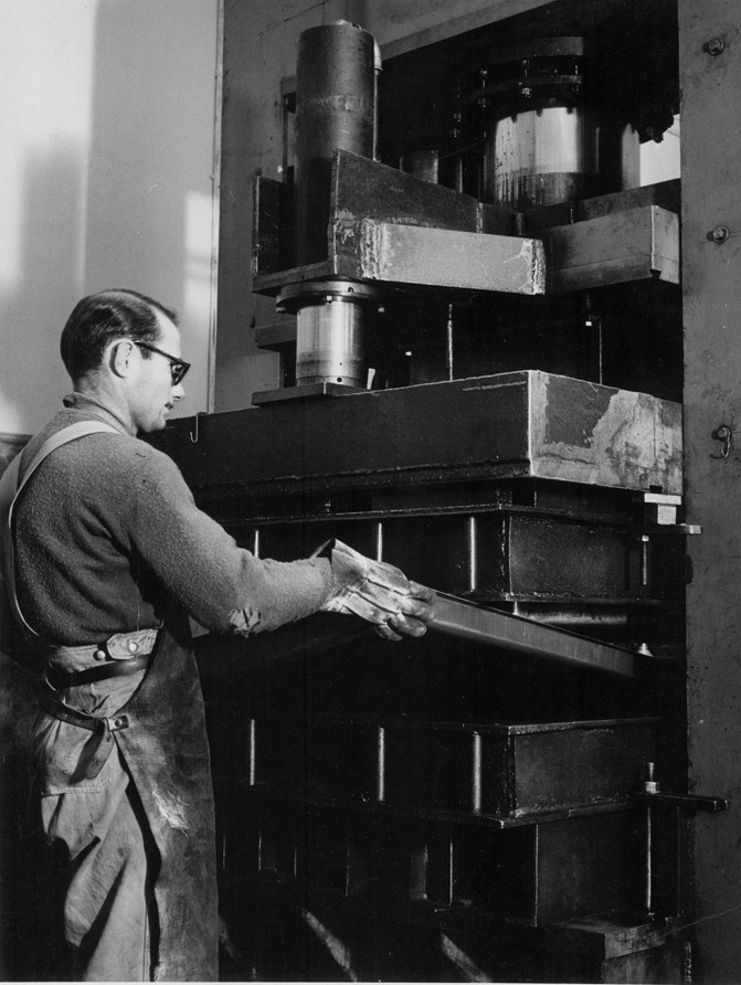 La imagen refleja a trabajadores realizando el prensado de puertas de heladeras de consumo particular en la industria metalúrgica Venco S.R.L, ubicada en el barrio de Villa Martelli.