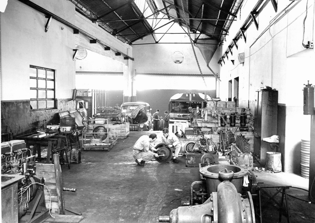 En esta imagen, se aprecia el interior de las instalaciones de Casa Stewart S.A., una empresa dedicada a la fabricación de partes, piezas y accesorios para vehículos automotores y sus motores. El establecimiento se encontraba ubicado en Avenida Vélez Sarsfield, en la localidad de Munro.