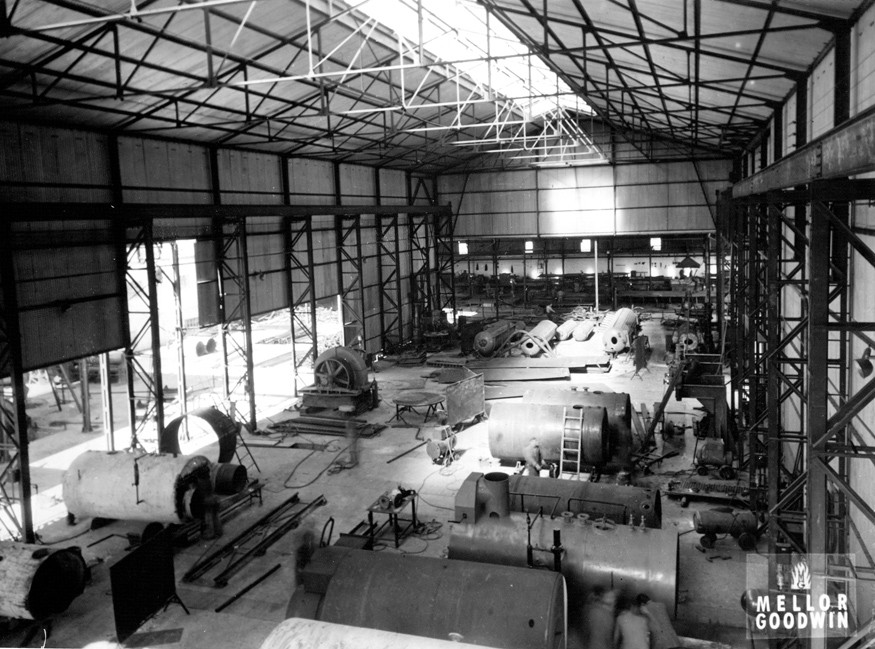Galpón de Mellor Goodwin Combustión S.A. en el barrio de Munro. Con más de 80 años de experiencia desde su fundación en 1934, esta empresa destaca por su especialización en el montaje de plantas industriales y diversas actividades especializadas en construcción. Recientemente, trasladaron sus operaciones a las instalaciones previas de la empresa Termoeléctrica en Banfield, Buenos Aires.