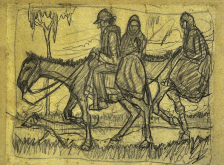 Boceto de una escena campestre por Alfredo Gramajo Gutiérrez, pintor de origen tucumano y residente en Olivos. Con un destacado estilo costumbrista, Gramajo Gutiérrez se formó académicamente en la Sociedad Estímulo de Bellas Artes (SEBA) y la Escuela Nacional de Artes Decorativas. Residió en Olivos durante gran parte de su vida hasta su fallecimiento en 1961, a la edad de 68 años. Su obra se enfoca en la vida cotidiana y las costumbres de los pueblos, especialmente del noroeste argentino, abordando tradiciones, pensamiento religioso y supersticioso de los provincianos. Fiestas, ceremonias religiosas, rituales, promesantes de la Virgen, iconografía cristiana, carnavales, mercados populares y entierros son algunos de los temas recurrentes en sus pinturas.
