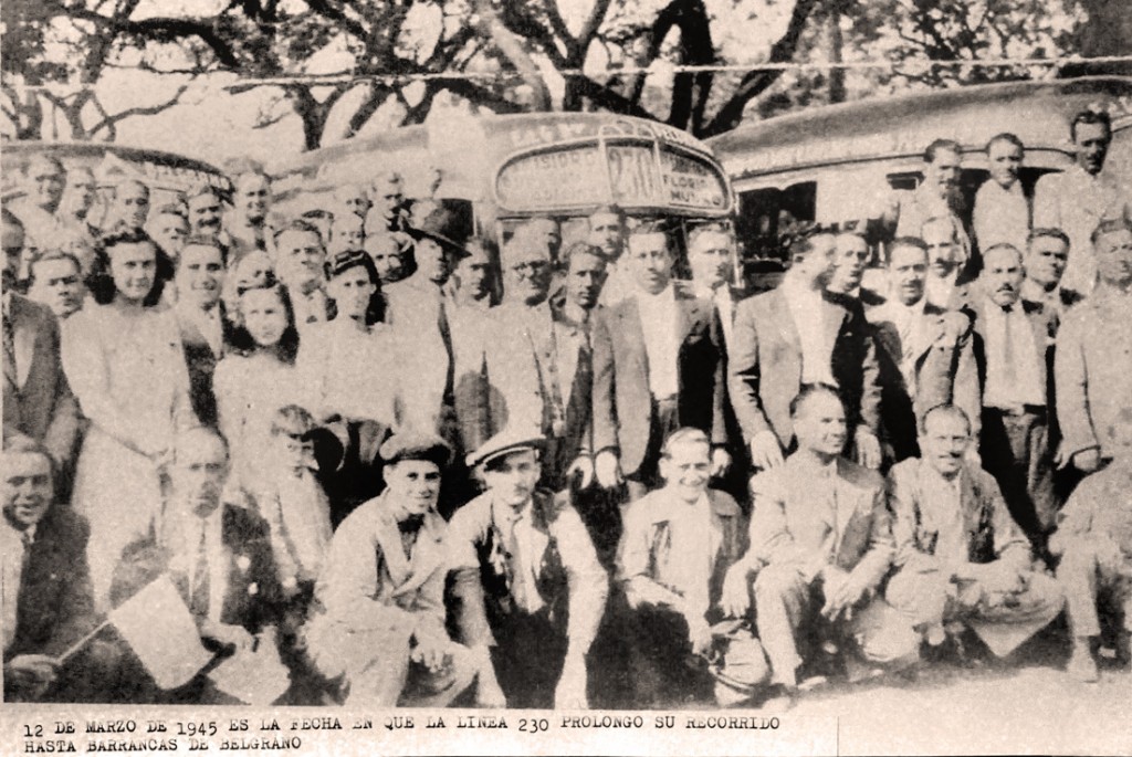 En la imagen, choferes y vecinos de la línea 230 de colectivos, actual 130, posan para conmemorar la prolongación del recorrido, que se extendía hasta Barrancas de Belgrano, en la Ciudad Autónoma de Buenos Aires.