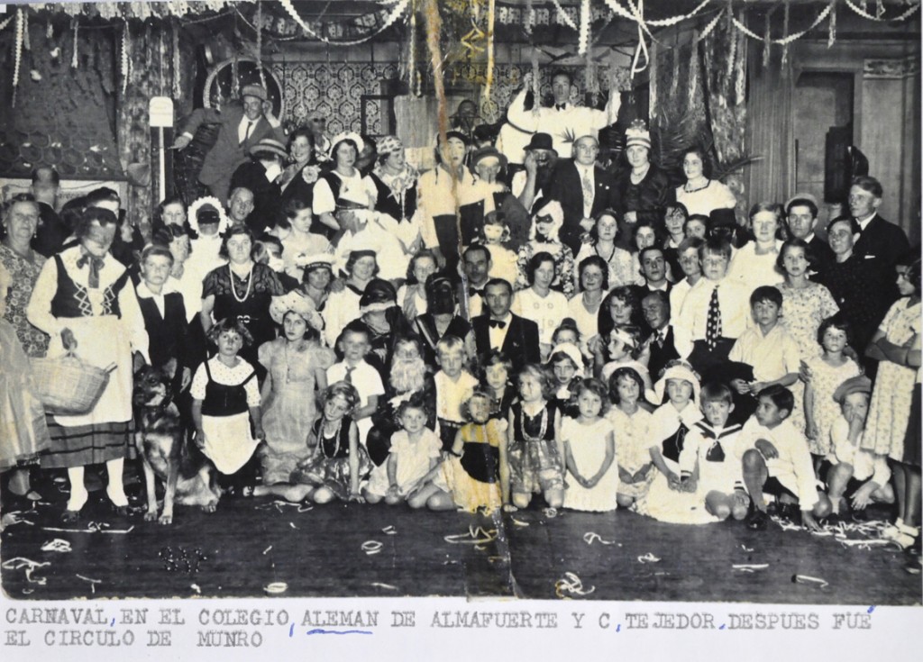 Carnaval celebrado en el colegio alemán, ubicado en la intersección de las calles Almafuerte y Carlos Tejedor. Con el tiempo, este edificio pasó a ser el Magazine y posteriormente el Círculo de Munro.