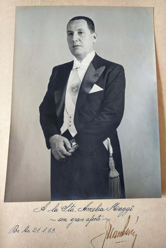 Fotografía del Presidente Juan Domingo Perón, dedicada por él mismo, a la Srta. Amelia Maggi.