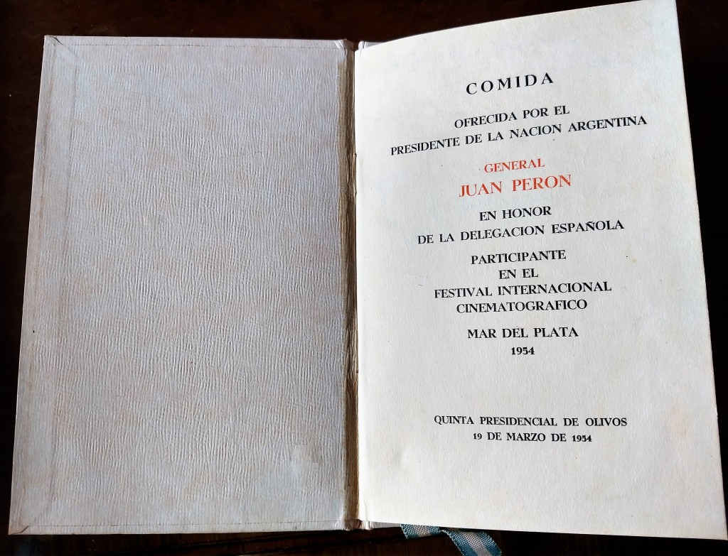 La imagen exhibe el menú de una cena organizada por el presidente de la Nación en ese momento, Juan Domingo Perón, en la Residencia Presidencial, conocida como Quinta de Olivos.