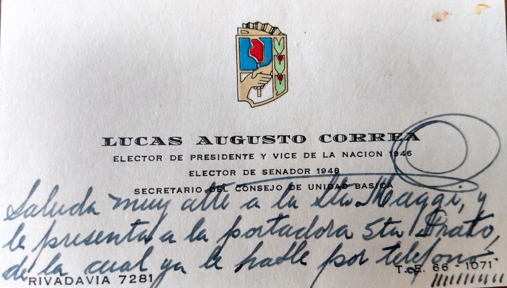 La imagen muestra una tarjeta con un saludo manuscrito de Lucas Augusto Correa, quien fue Elector de Presidente y Vicepresidente de la Nación en 1946, así como Elector de Senador en 1948 y Secretario del Consejo de Unidad Básica.