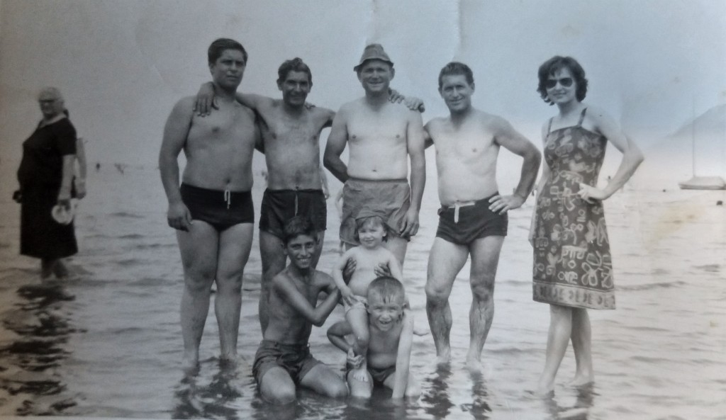 Una familia disfruta de un día en la playa El Ancla, ubicada en el balneario Punta Bikini. Este lugar era reconocido por la presencia de bancos de arena, conocidos como "bikinis", que emergían en la superficie. Situado en la calle Yrigoyen, entre Emilio Parravicini, actualmente Hipólito Yrigoyen, e Italia, el balneario, inicialmente conocido como Los Ángeles, ofrecía una amplia gama de instalaciones, que incluían un salón, una pista de baile, vestuarios y una piscina de 1.000.000 litros de agua proveniente de un pozo.
