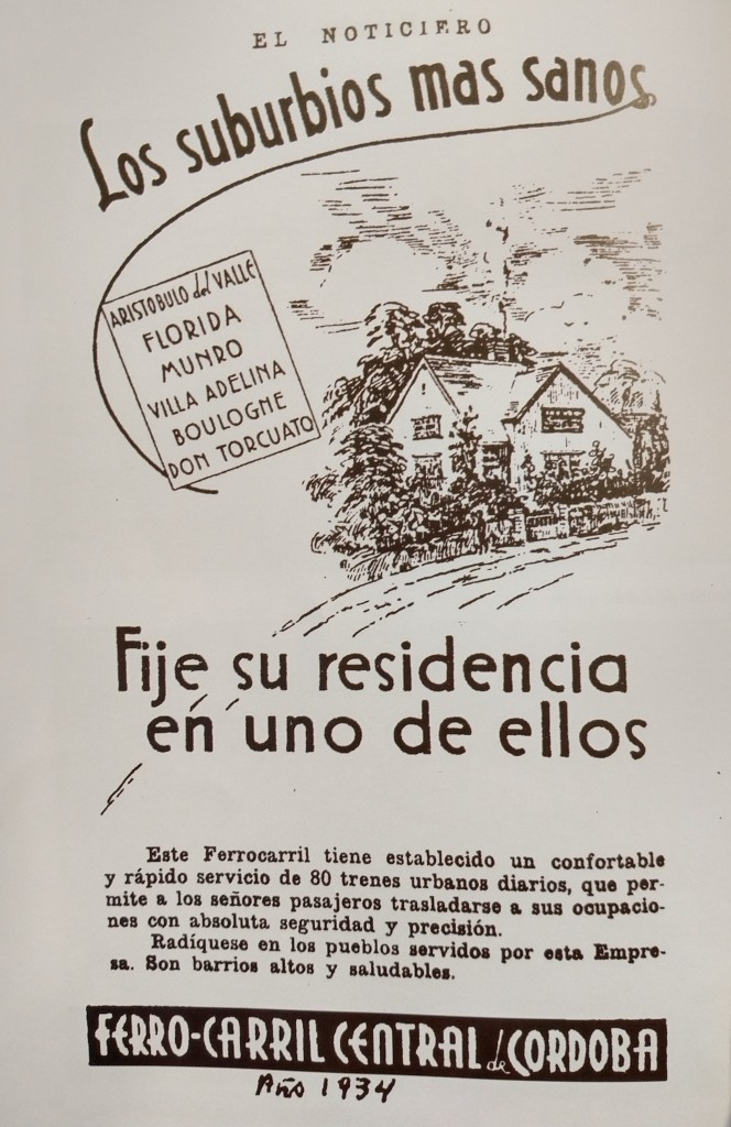 El aviso del Ferrocarril Central de Córdoba, publicado en El Noticiero de 1934, promovía la radicación en distintas localidades, entre ellas Aristóbulo del Valle, Florida, Munro, Villa Adelina, Boulogne y Don Torcuato, para aprovechar su servicio de trenes urbanos diarios.