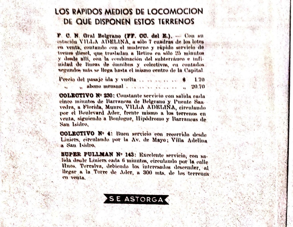 La promoción del loteo de tierras en Villa Adelina incluía la especificación del servicio de ferrocarril y colectivos disponibles en la zona.