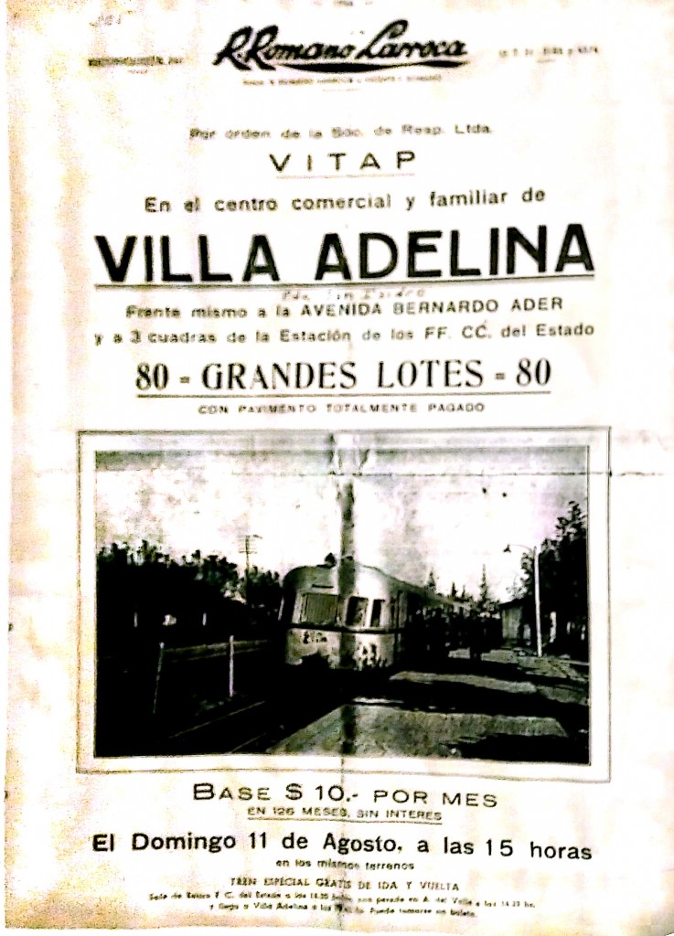 Aviso de remate de ochenta amplios lotes ubicados en calles pavimentadas, situados en el centro comercial de Villa Adelina. Las propiedades se encontraban frente a la avenida Dr. Bernardo Ader y a tres cuadras de la estación. El remate fue organizado por Romano Larroca.