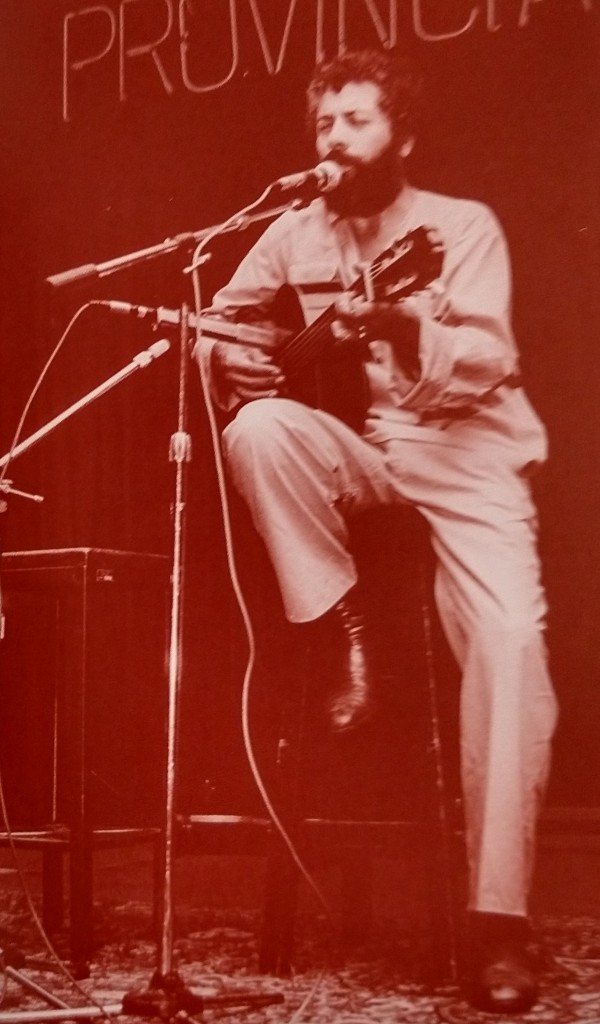 En la imagen se ve a Facundo Cabral actuando en el Club Atlético Banco de la Provincia de Buenos Aires, ubicado en Presidente Hipólito Yrigoyen 803, Vicente López.