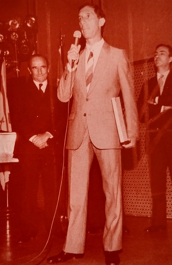 En la imagen se ve a Carlos Bilardo hablando durante el show organizado por el equipo de fútbol del Club Atlético Banco de la Provincia de Buenos Aires, ubicado en Presidente Hipólito Yrigoyen 803, Vicente López.