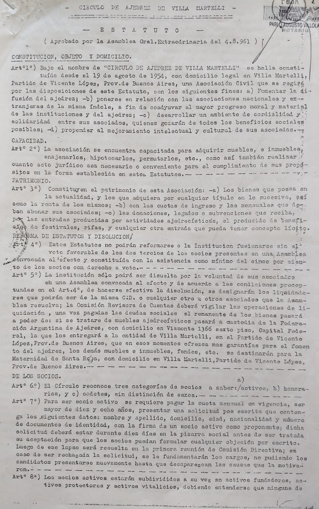 Ordenanza de creación del círculo de ajedrez de Villa Martelli.
