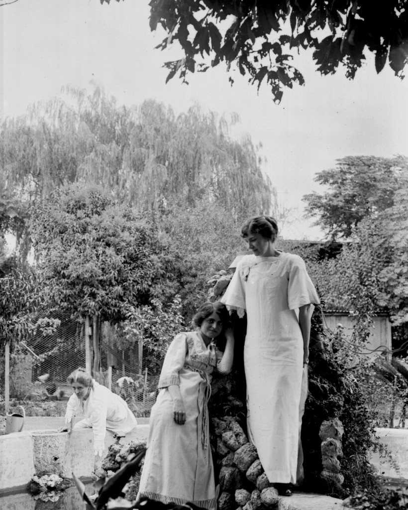 Rosa Gay Allaix, Susana Ferrer y Estela Borges, esposa del militar Francisco Borges, posan en los jardines de Villa Rosa, una casona en la esquina de Francisco Beiró y Martín Haedo.