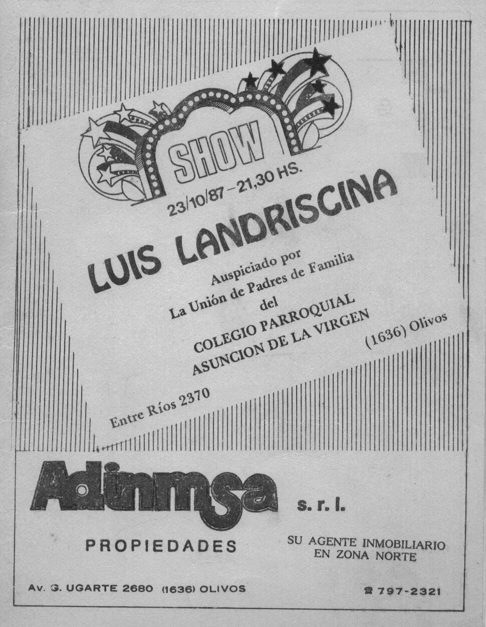 Folleto de show de Luis Landriscina auspiciado por la "Unión de padres de familia" del colegio parroquial La Asunción de la Virgen.