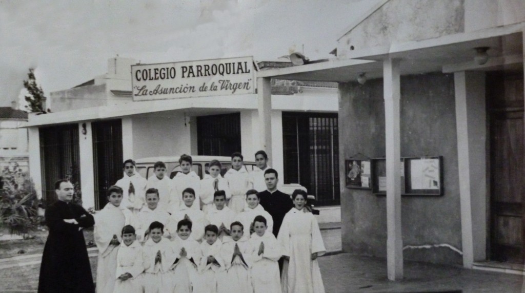 Uno de los primeros acólitos de la Parroquia La Asunción de la Virgen y alumnos del colegio junto al presbítero Juan A. Jarillo, fundador del colegio parroquial La Asunción de la Virgen.