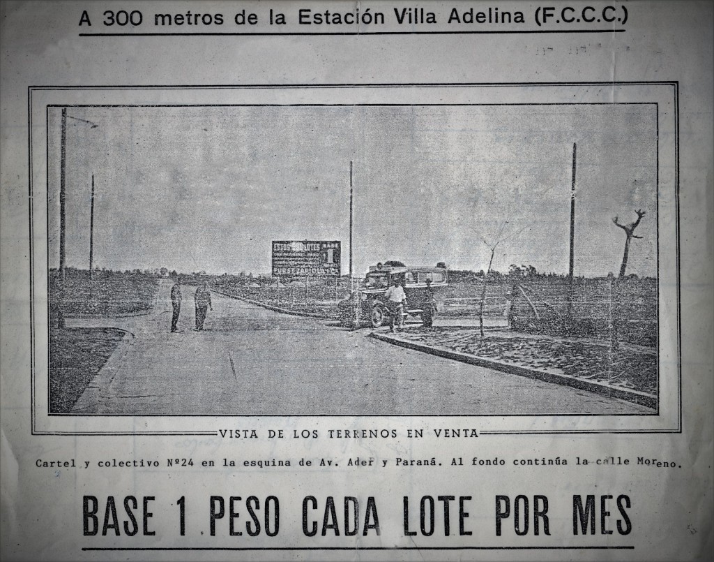 El folleto promocional destaca la venta de tierras en la zona de Estación Villa Adelina, mostrando una imagen que captura la esquina de las calles Avenida Ader y Paraná.