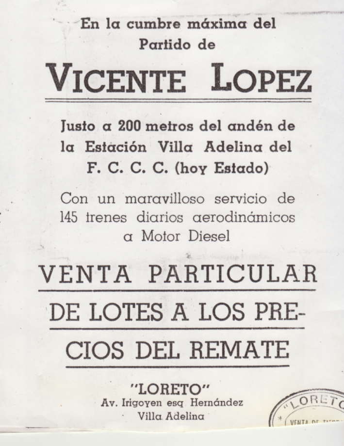 Folleto promocional por venta de tierras a 200mts. de la Estación Villa Adelina por la empresa Loreto.