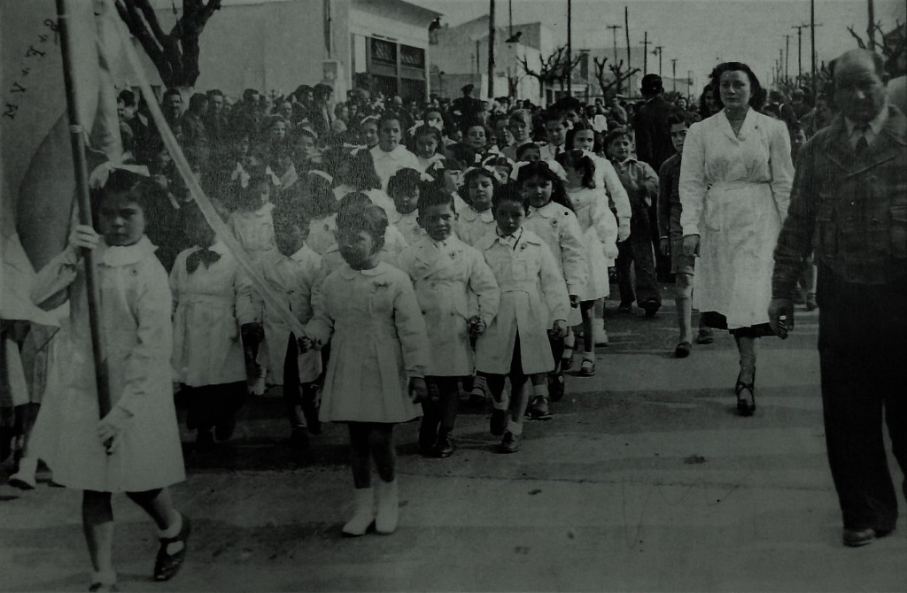 El desfile ceremonial de niños del Jardín de Infantes de la Sociedad de Fomento y Cultura de Villa Martelli, recorriendo la actual calle Francisco Narciso Laprida.