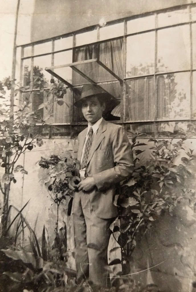 Antonio Cases, vecino de Munro, posando para una fotografía frente a su domicilio en la calle Leandro N. Alem.