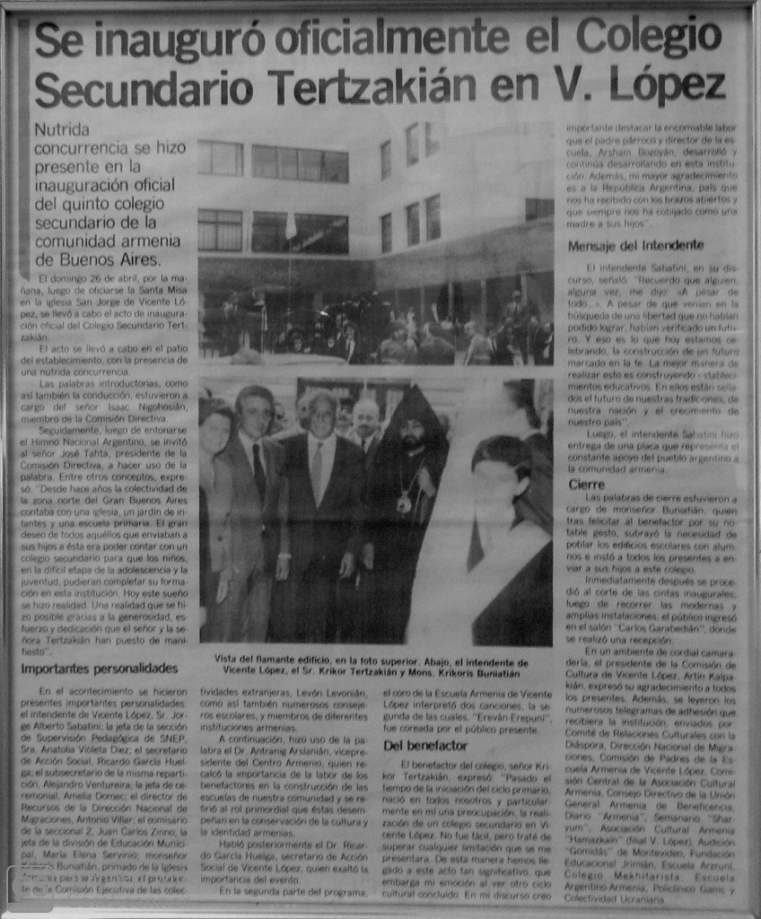 Nota del diario Clarín que informa sobre la inauguración del nivel secundario del Colegio Armenio de Vicente López, denominado Instituto Tertzakian en honor a su benefactor, en el año 1987.