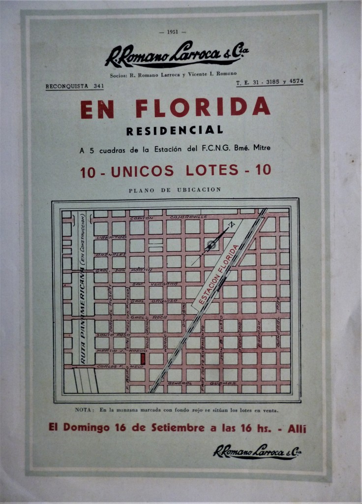 Folleto promocional de venta de diez lotes ubicados a cinco cuadras de la estación Florida, en el sector residencial del barrio.