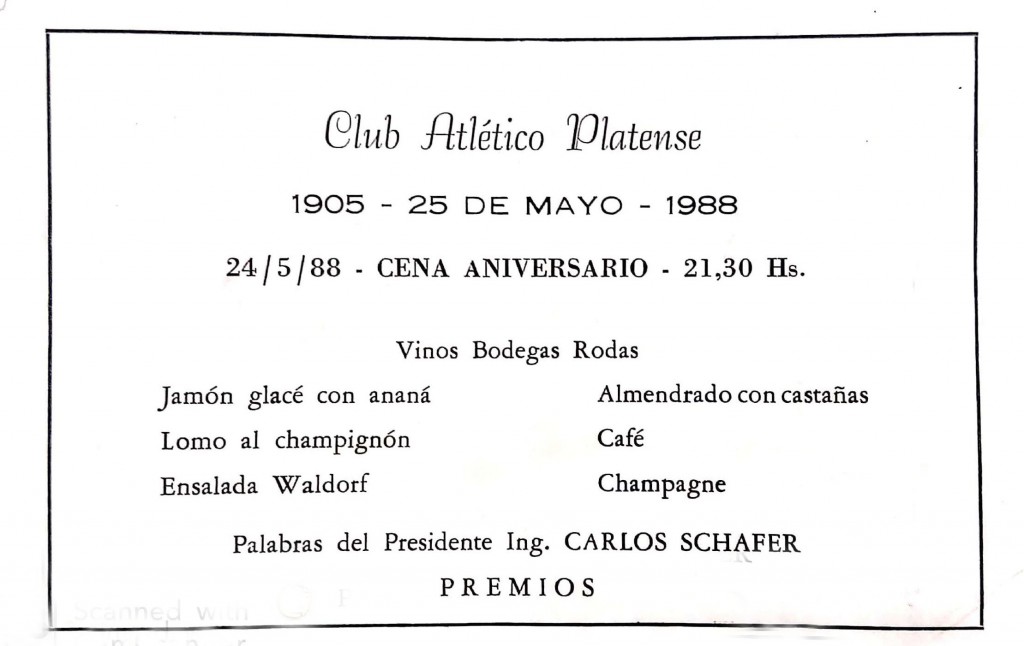 Menú y tarjeta conmemorativos del 83 aniversario del Club Atlético Platense.