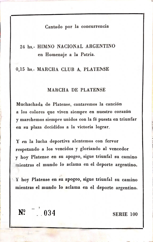 Marcha de Platense escrita en un volante otorgado con motivo de 84 Aniversario del club.