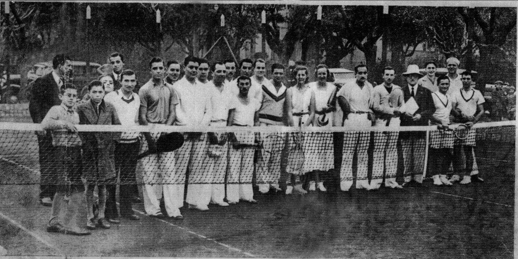 Imagen de jugadores y socios posando en la cancha principal del Olivos Tenis Club, ubicado en Salta 2753.
