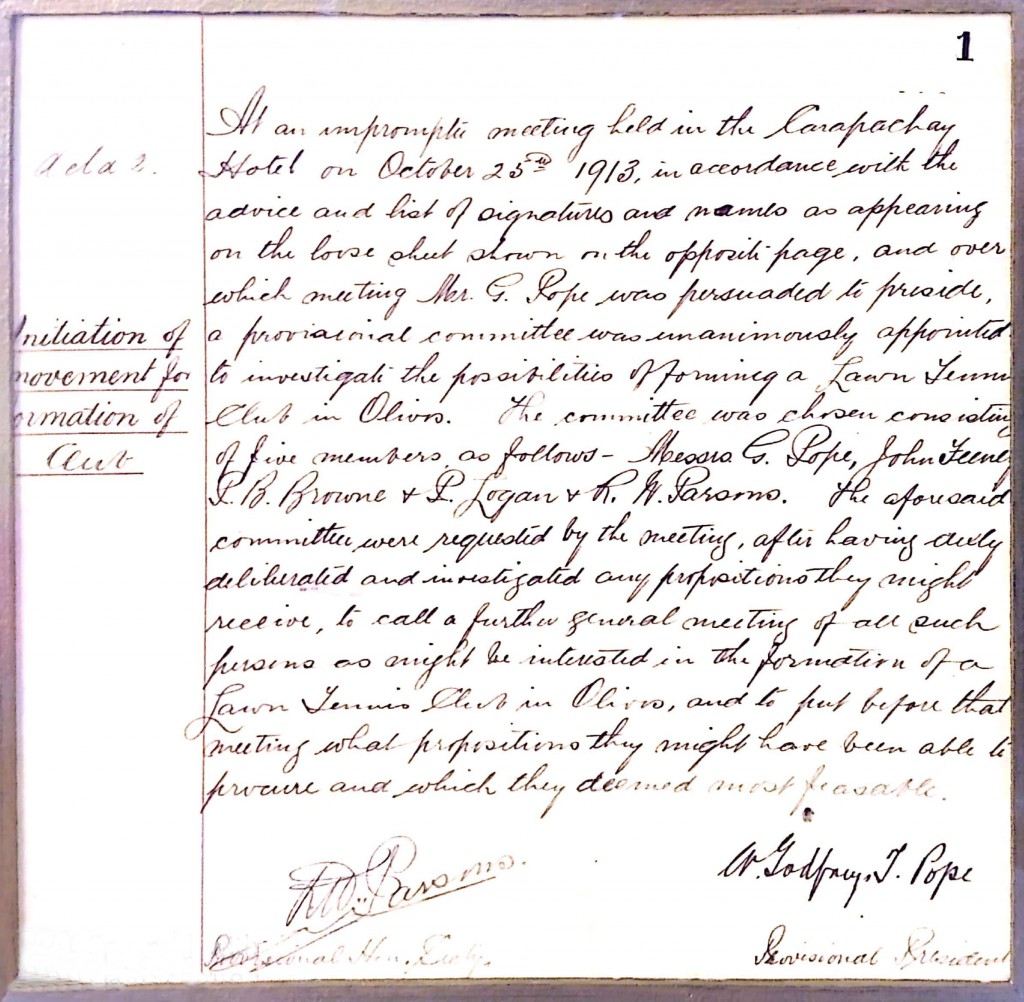 Acta fundacional del Olivos Tenis Club en inglés y su traducción al español. Originalmente conocido como Olivos Lawn Tennis Club, fue fundado el 25 de octubre de 1913 por un grupo de inmigrantes ingleses empleados del Ferrocarril Central Argentino.