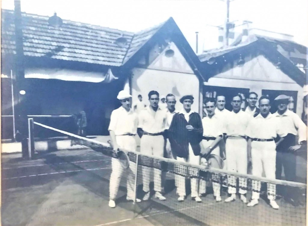 Primer torneo nocturno del Olivos Tenis Club, ganado por el Sr. Eduardo Maurette y el Dr. Tulio Martini, primero y segundo adelante desde la derecha, quienes vencieron a los señores Besler y Ollua, primero y segundo desde la izquierda. La foto fue tomada al día siguiente cuando el club les ofreció un asado para homenajearlos, en septiembre de 1914.