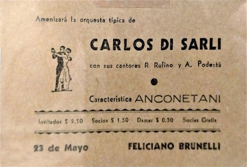 Entrada al show de la orquesta típica de Carlos Di Sarli, con la participación de sus cantores R. Rufino, Podestá y Feliciano Brunelli, celebrado en el Club Unión de Olivos. El club tiene su sede en Domingo Faustino Sarmiento 3551, en Olivos.