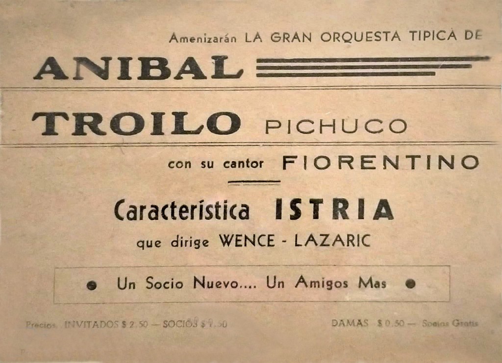 Entrada al espectáculo de la orquesta típica de Aníbal Troilo "Pichuco", realizado en conmemoración del aniversario del Club Unión de Olivos, ubicado en Domingo Faustino Sarmiento 3551, en Olivos.
