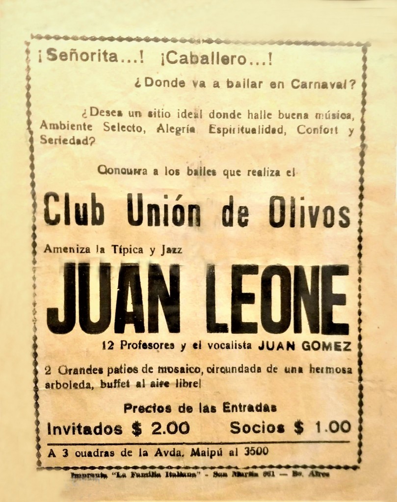 Entrada al show de la orquesta típica de Jazz Juan Leone realizado en el Club Unión de Olivos.