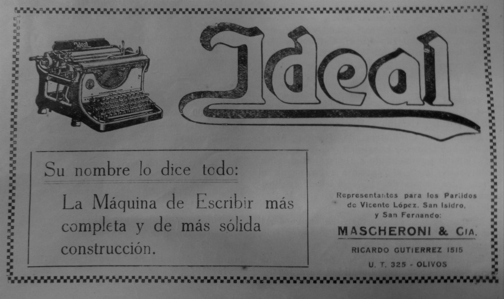 Anuncio del comercio Mascheroni & Cía, localizado en Ricardo Gutiérrez 1515, Olivos, promocionando la máquina de escribir Ideal.
