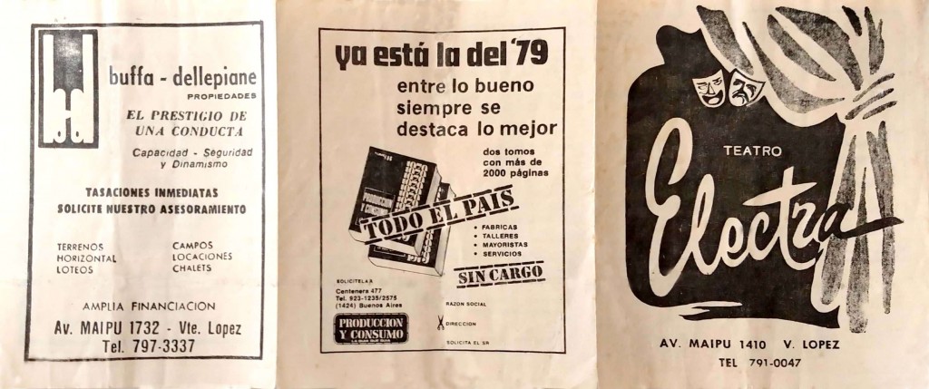 Frente del programa de mano de un espectáculo costumbrista que se desarrollaba en el Cine Teatro Electra, ubicado en Avenida Maipú 1410, esquina Valentín Vergara en el barrio de Florida.