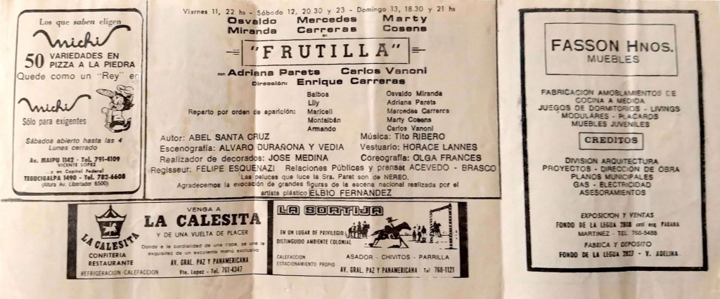 Dorso del programa de mano de un espectáculo costumbrista que se desarrollaba en el Cine Teatro Electra, ubicado en Avenida Maipú 1410, esquina Valentín Vergara en el barrio de Florida.