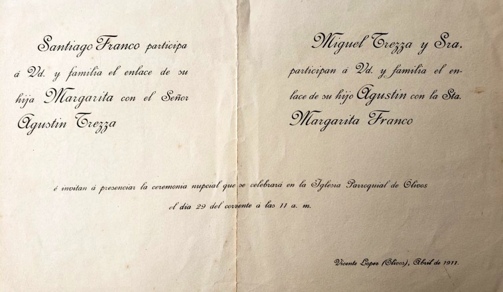 Invitación para el casamiento de Margarita Franco con Agustín Trezza, que tuvo lugar hacia abril de 1911 en la Iglesia Parroquial de los Olivos, ahora conocida como Iglesia Jesús en el Huerto de los Olivos.