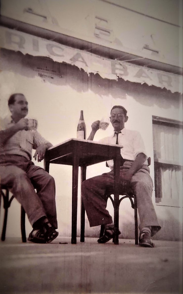 Dante Luis Curti y Ángel Kanisky en el Bar América, actualmente conocido como Distribuidora D&G, ubicado en la intersección de la calle Esmeralda y la Avenida Bartolomé Mitre.